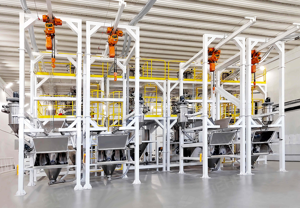 The newly delivered automated powder material production line covers processes such as unpacking and feeding, batching, mixing, conveying, and packaging. Its production efficiency is twice that of traditional equipment. In the automatic batching stage, raw materials are discharged through an integrated unpacking station that can handle both ton-bags and small sacks. The conical bottom of the unpacking station is connected to a vacuum feeding machine, ensuring a fully enclosed and dust-free operation as the powder materials are vacuum-conveyed to their corresponding raw material silos. All parts in contact with the powder materials are made of SS304 stainless steel. Its excellent corrosion resistance and high hygiene standards can effectively prevent material contamination, thereby ensuring the quality and safety of the processed products.