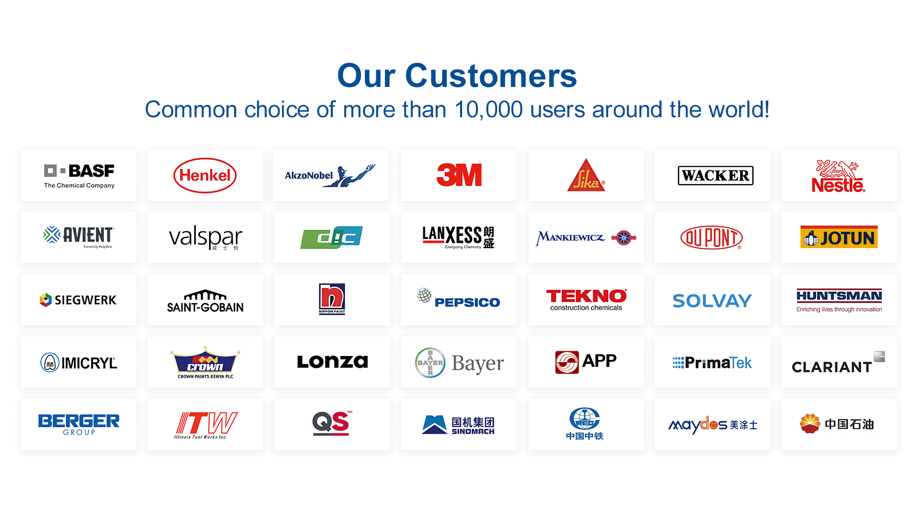 شبكة الخدمات العالمية: تعمل SIEHE في ست قارات حول العالم، حيث قدمت منتجات وخدمات لعشرات الآلاف من الشركات في أكثر من 100 دولة، وحظيت بإشادة واسعة النطاق. تشمل قائمة عملائنا شركات ذات شهرة عالمية مثل BASF و Bayer و AkzoNobel و Henkel و JOTUN و WACKER.