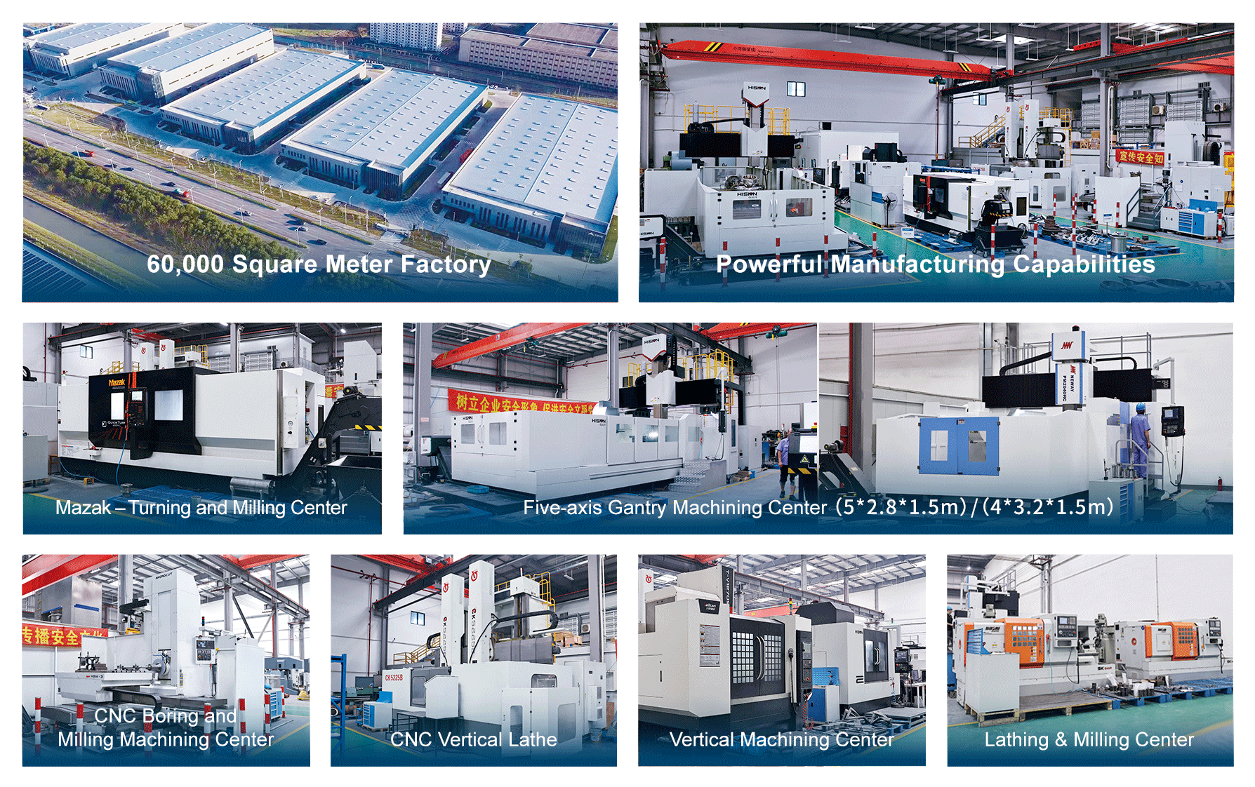 قدرات تصنيع قوية: نحن نمتلك قدرات إنتاجية ومراقبة جودة قوية، حيث أننا مجهزون بمراكز خراطة وتفريز من Yamazaki Mazak، ومراكز تصنيع كبيرة ذات خمسة محاور، ومراكز حفر وتفريز أفقية ذات خمسة محاور، ومخارط عمودية CNC، ومراكز تصنيع عمودية.