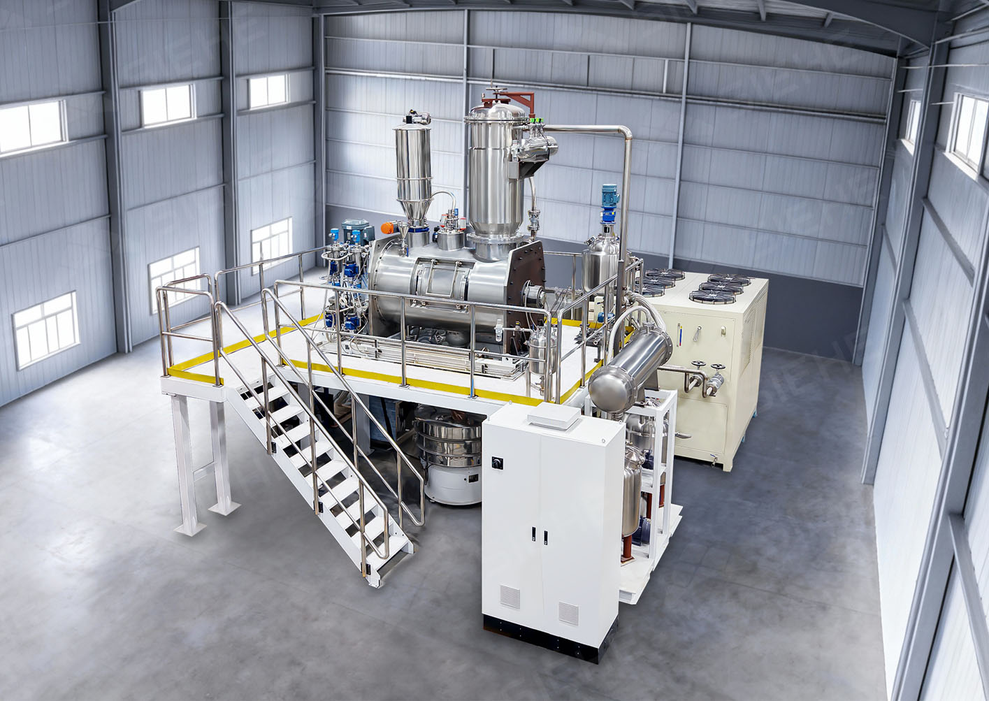 نظام الخلط والتجفيف: المعدات الأساسية هي خلاط تجفيف أفقي من نوع المحراث. تم تصميم عموده الرئيسي والمحرك على شكل محراث بتقنية ثلاثية الأبعاد لتوليد حركة محورية وشعاعية مكثفة للمواد أثناء الدوران عالي السرعة، مما يعزز توحيد وكفاءة الخلط. الفراغ بين الشفرات والغرفة ضئيل (5±2 مم) لتقليل البقايا. تعمل المفرمات عالية السرعة المثبتة على الجانب على تفتيت المواد المتكتلة وتفكيكها بسرعة، مما يمنع تكتل الرطوبة. مزودة بغطاء تسخين ونظام تكثيف فراغي، تعمل البيئة المختومة عالية الفراغ على خفض درجة غليان السائل، مما يتيح تجفيفًافعالاً بدرجة حرارة منخفضة.