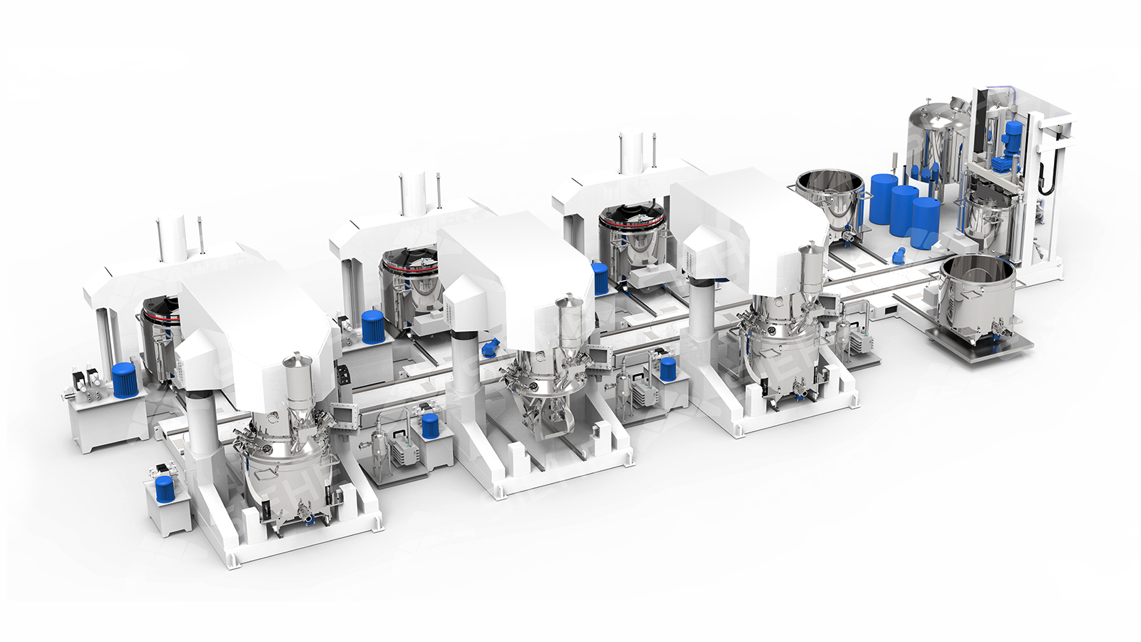 بناءً على متطلبات العميل من حيث المواد وعملية الإنتاج، قمنا بتصميم مجموعة من خطوط الإنتاج الكاملة الأوتوماتيكية للمواد اللاصقة للعملاء، ويتكون الخط بأكمله من نظام تغذية المسحوق، ونظام تغذية السوائل، ونظام تغذية المكونات المساعدة، ونظام الخلط والبثق، ونظام تنظيف الخزانات واستعادة المذيبات، ومسار التحريك الأوتوماتيكي للخزانات، ونظام التحكم، وما إلى ذلك.