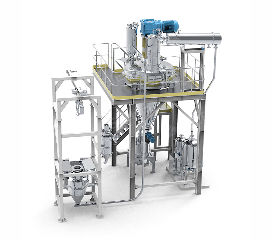 يعمل برميل المجفف أيضًا كصومعة. يتم نقل المسحوق المجفف بواسطة ناقل لولبي إلى خزان القياس للتجزئة التدريجية. يتم تثبيت مغذي فراغي في الجزء السفلي من خزان القياس لنقل المسحوق النهائي إلى خزان القياس الوسيط للتخزين المؤقت؛ ثم ينقل المغذي الفراغي المسحوق الموجود في خزان القياس الوسيط إلى الخلاط الكوكبي.